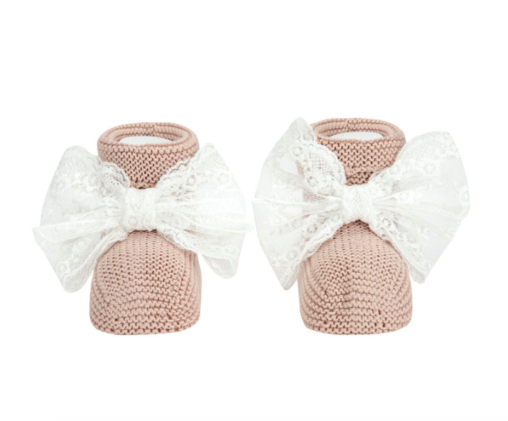 Description: White garter-stitch baby bootie with bobbin-lace bow detail.