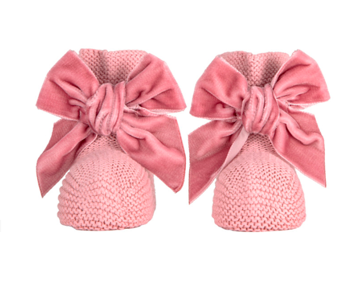 Description: White garter-stitch baby bootie with Velvet bow detail.