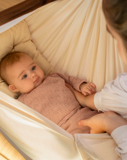 Care Instruction: The baby hammock can be hand washed at 40 degrees. The kapok mattress cannot be washed in the washing machine – air it outdoors about once a month. Baby hammocks are not suitable for children who can sit or kneel or pull themselves up.