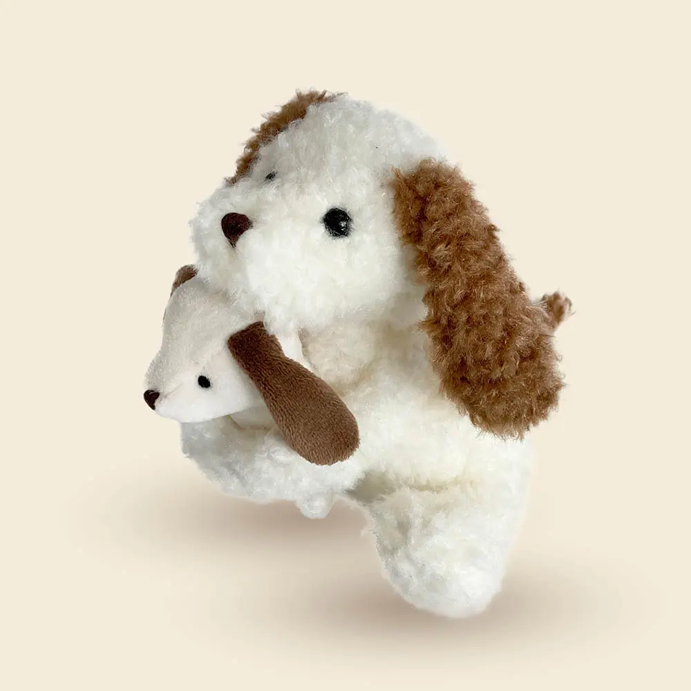 Description: Slip your fingers inside and watch Nafi cuddle her tiny baby close. Suddenly, quiet moments become gentle puppet shows where mummy dog rocks her little one to sleep. Little hands learn nurturing through play whilst enjoying the softest plush fur and carefully embroidered features. Hand-finished details mean this cuddly pair will last through countless bedtime stories. A treasured keepsake that grows more precious with time. Perfect for creating magical moments together or as a thoughtful gift for someone special.